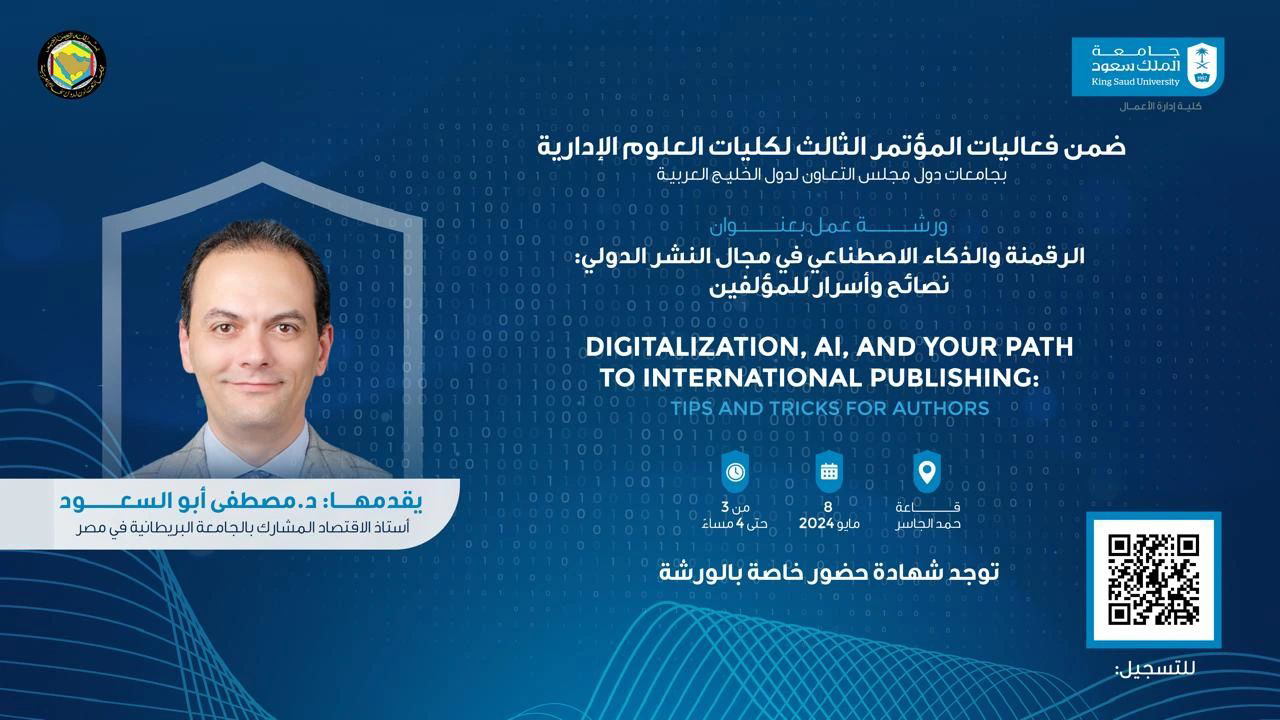 I am incredibly grateful to Professor Rima Hassan Bin Saeed, Dean of the College of Business Administration at King Saud University (KSU) , for giving me the opportunity to deliver a workshop on “Digitization, Artificial Intelligence, and the Secrets of International Publishing: Tips for Authors” in Riyadh, Saudi Arabia: The Third Conference of Colleges of Administrative Sciences at Universities in the Gulf Cooperation Council Countries “The Impact of Digital Transformation on the Economy and Business.” Special thanks to Professor Mohammed ALOjail Mohammed A. Alojail, Vice Dean of the College of Business Administration for Graduate Studies and Research, for his valuable ideas and fruitful discussions.